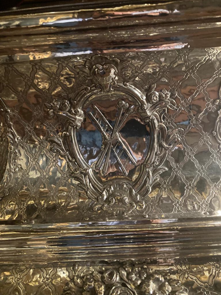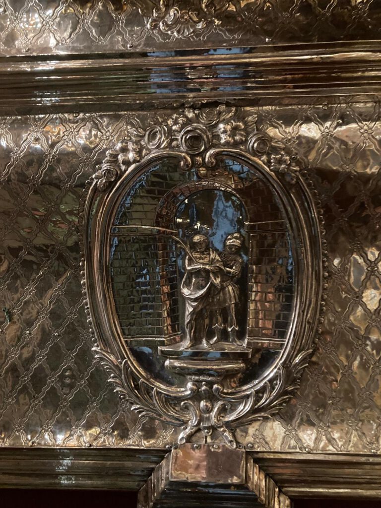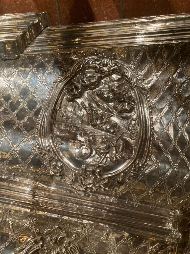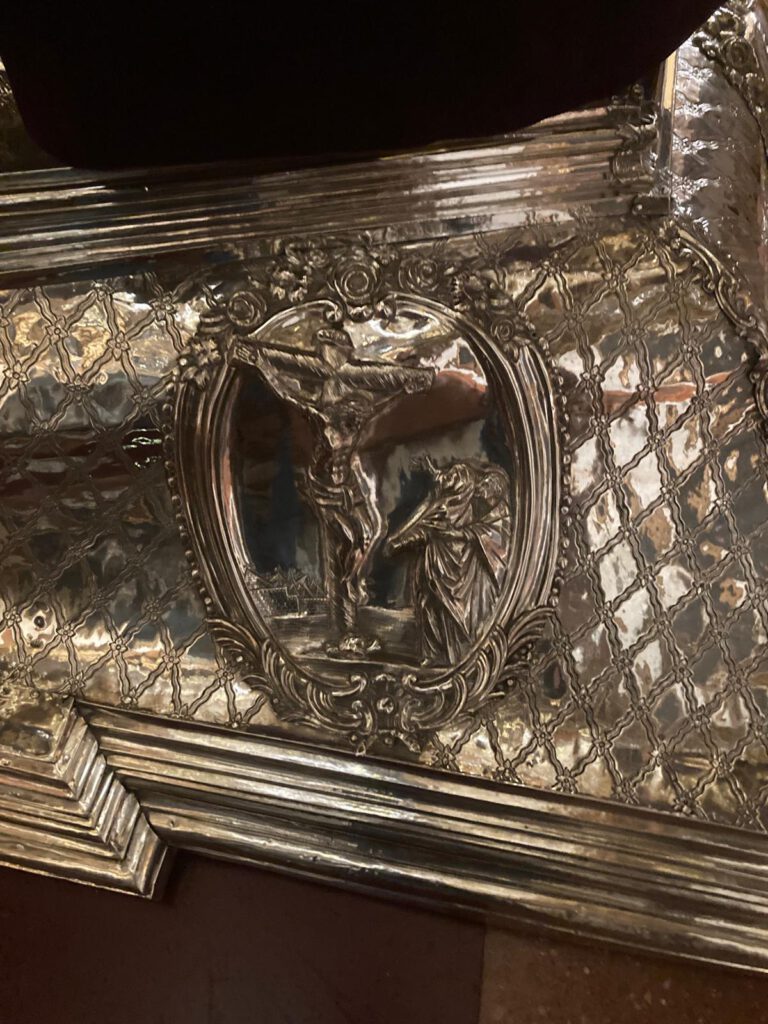 En las esquinas sobre orejetas angulares se sitúan seis ángeles ceroferarios de plata, cuatro en la parte inferior y dos en la superior.