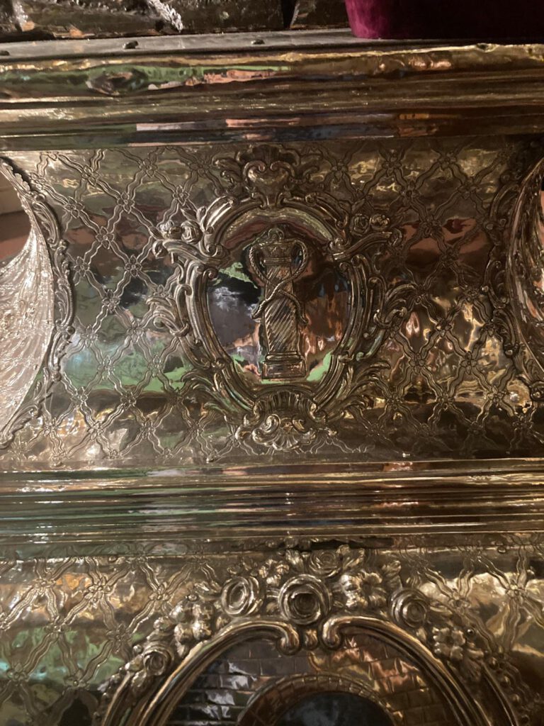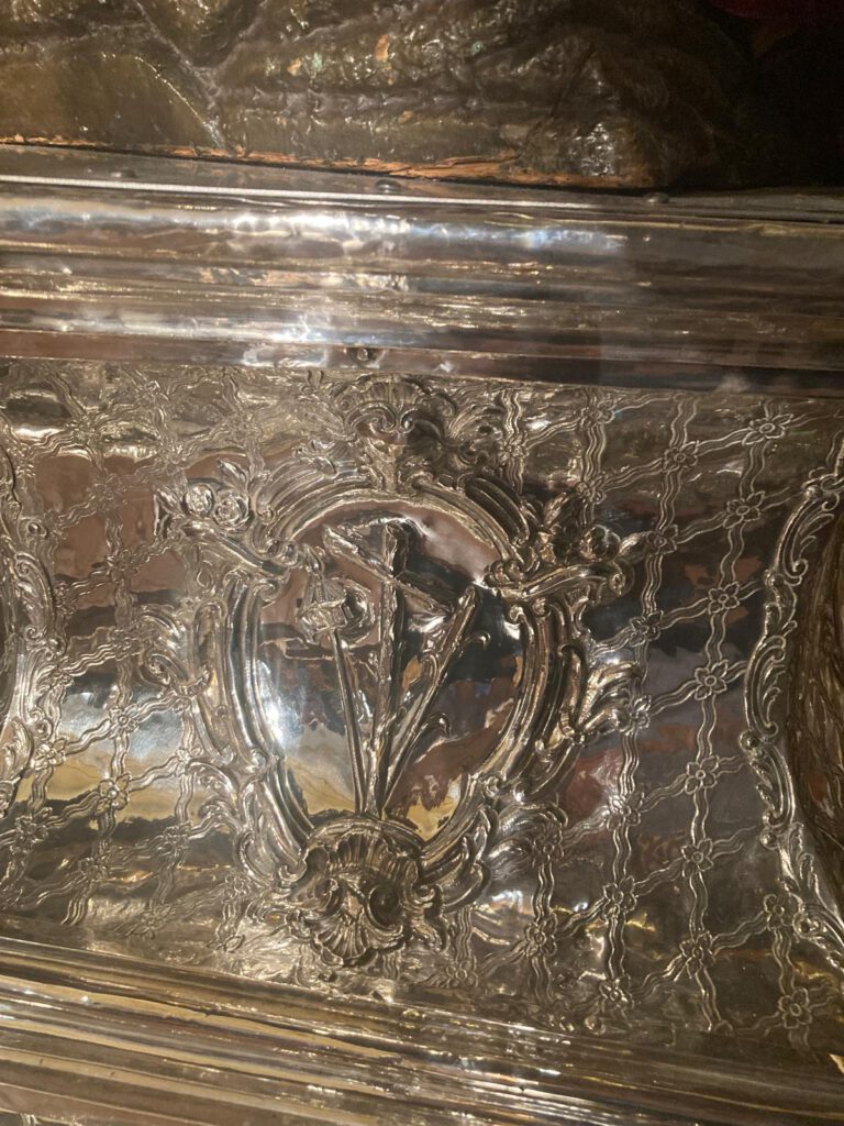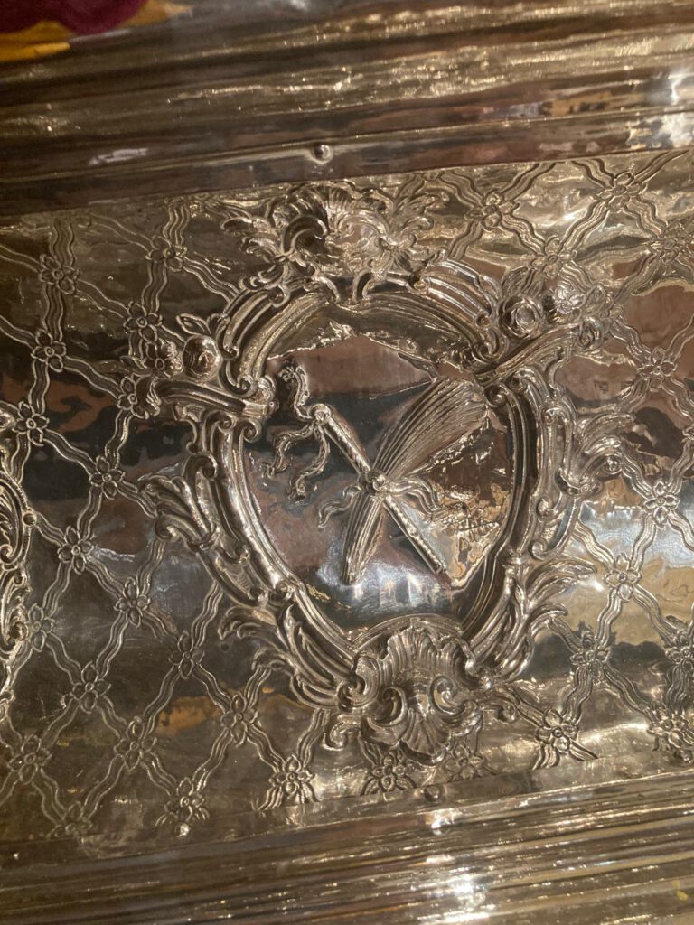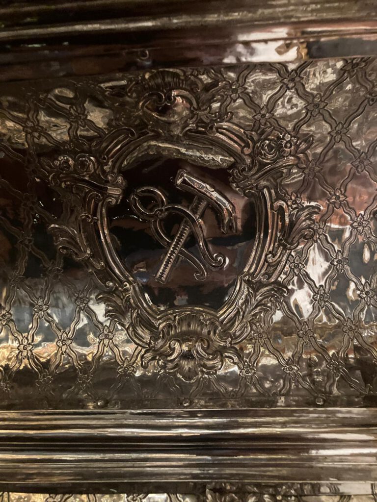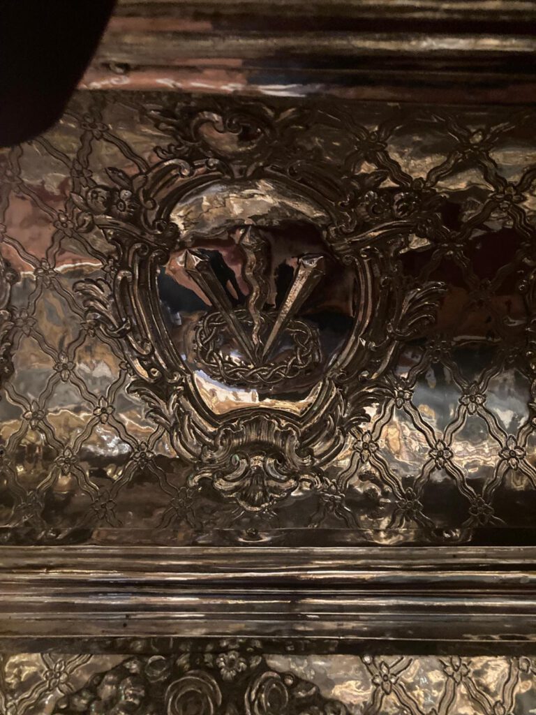 En las esquinas sobre orejetas angulares se sitúan seis ángeles ceroferarios de plata, cuatro en la parte inferior y dos en la superior.