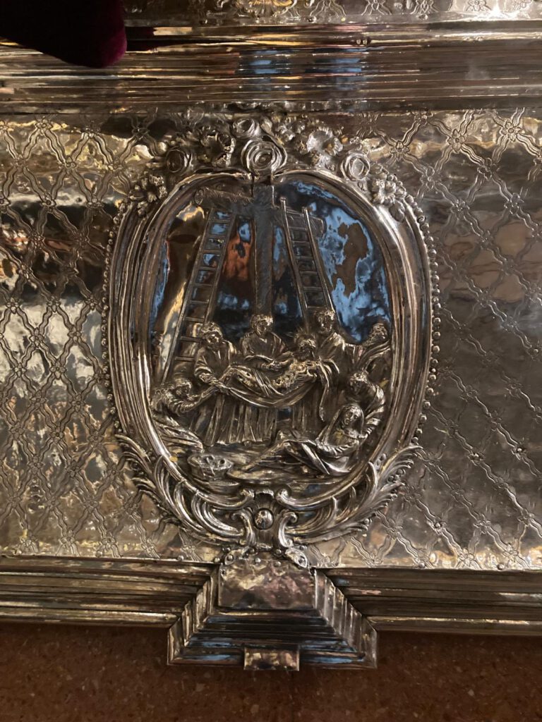 La imágen va sobre peana de plata obra del Cristóbla Sánchez y Soto fechada el 18 de marzo 1780 y donada por don Gonzalo Manuel de Lando y Lanzos, Conde de Mazeda Fuente de el Saúco para que procesionara de Nuestra Señora la Soledad, antigua Titular de la Cofradía. Estructura piramidal hexagonal en dos cuerpos con laterales curvados, cincelada en plata a base de retículas con motivo vegetales que ornamenta en cada uno de sus frentes el campo sobre el que se disponen orlados doce medallones con escenas y atributos pasionales. En la base inferior se encuentra cincelada las escenas de la Pasión de Cristo: Jesús ante ante Anás; Ecce Homo; Jesús con la cruz a cuestas; el Calvario; Descendimiento y Oración en el Huerto de los Olivos. En la parte superior se aprecian símnolos pasionistas: